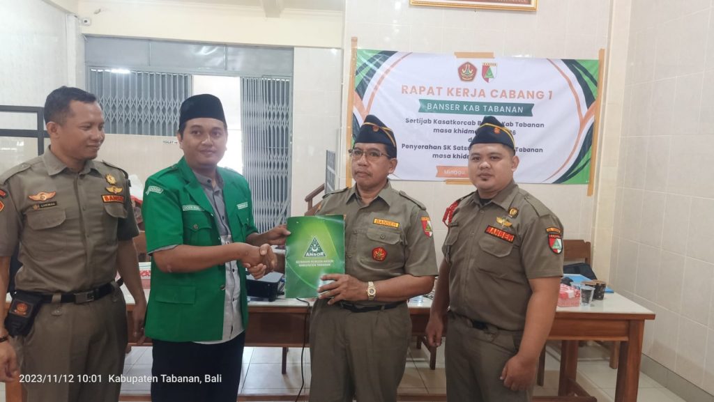 Pimpinan Cabang (PC) Gerakan Pemuda (GP) Ansor Kabupaten Tabanan menggelar kegiatan Rapat Kerja Cabang (Rakercab) ke-1 sekaluigus penyerahan Surat Keputusan (SK) Banser Kabupaten Tabanan masa khidmat 2022-2026 di terminal kediri, Ahad (12/11/2023).